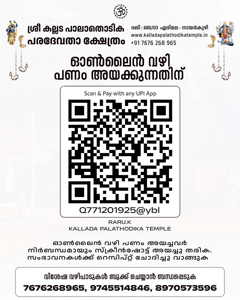 ക്ഷേത്രത്തെക്കുറിച്ച് എന്തെങ്കിലും സംശയങ്ങളോ പൂജാ വഴിപാടുകൾ സംഭാവന തുടങ്ങിയ കാര്യങ്ങളിൽ മുകളിൽ സംശയമുണ്ടെങ്കിൽ ബന്ധപ്പെടുവാൻ താഴെ കൊടുത്ത ലിങ്ക് ക്ലിക്ക് ചെയ്യുക ഇത് വാട്സ്ആപ്പ് ചാറ്റ് ആണ്